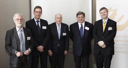 Flankiert von den GD-Vorstandsmitgliedern Professor Dr. Christel Müller-Goymann (rechts) und Professor Dr. Dr.-Ing. Jürgen Lademann (links) stellten sich die Erstautoren der prämierten Poster – Dr. Ute Wölfle, Freiburg, Dr. Marco Hoffmann, Freiburg, und Ming Chen, Jena (von links) – dem Fotografen Egbert Trogemann.