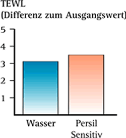Die kumulative Wirkung wiederholter Anwendung wurde im sogenannten Handtauchtest untersucht. Dazu tauchten Probanden mit normaler Haut oder mit empfindlicher Haut über einen Zeitraum von 4 Wochen mehrmals pro Woche im direkten Vergleich je eine Hand in eine warme Waschlauge (dosiert nach Dosieranleitung für Handwäsche) beziehungsweise in warmes Leitungswasser. Nach einer 4 wöchigen Anwendung im Handtauchtest an Probanden mit empfindlicher Haut wurde die Barrierefunktion bestimmt. Beide Testlösungen, Persil Sensitiv und Wasser, verursachten erwartungsgemäß leichte Hautschädigungen, die in einem geringfügigen Anstieg des TEWL-Wertes meßbar waren (Abbildung 3).