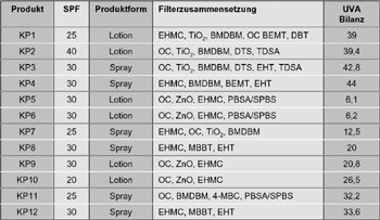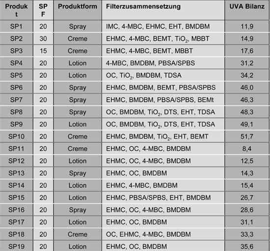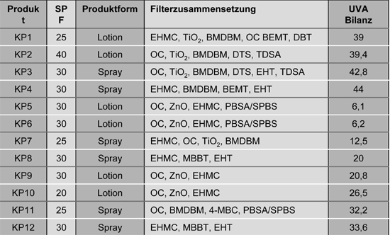 Tabelle 1: Übersicht über die in die Untersuchung einbezogenen Standardsonnenschutzprodukte
