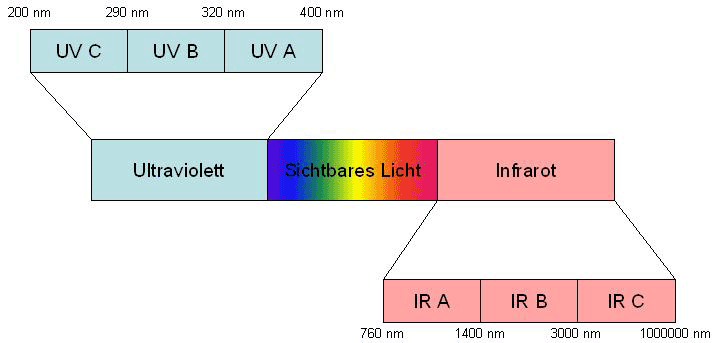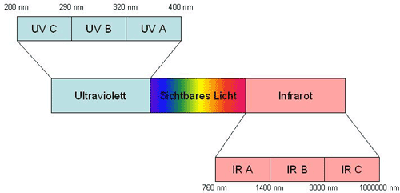 Abbildung 1: Spektrale Aufteilung der verschiedenen Wellenlängenbereiche des Lichtes in Ultraviolett-, Sichtbare und Infrarot-Strahlung.