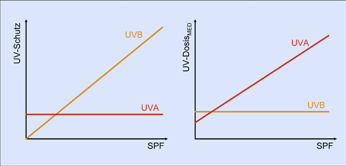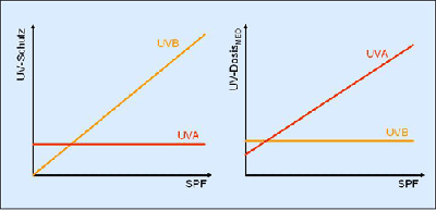 Dennoch spielt die Höhe des UVA-Schutzes bisher bei der Produktauswahl eine untergeordnete Rolle. Die Orientierung des Verbrauchers wird zusätzlich dadurch erschwert, dass die Ermittlung der Höhe des UVA-Schutzes und der zugehörigen Deklaration nicht einheitlich geregelt ist. Die meisten Hersteller folgen bei der Bestimmung des UVA-Schutzes den Vorgaben der Australischen Norm (4). Deren Anforderungen sind erfüllt, sobald ein Sonnenschutzmittel die Transmission im Bereich von 320 – 360 nm um mindestens 90 % reduziert. Die Australische Norm sieht oberhalb dieses Schwellenwertes keine weitere Differenzierung vor. Dies führt dazu, dass bei Einhaltung dieses Standards bei Produkten mit niedrigem SPF noch ein adäquater UVA-Schutz sichergestellt ist, mit steigendem SPF allerdings der UVA-Schutz auf gleich bleibendem Niveau stagnieren kann, ohne die Norm zu verletzen; der UVA-Schutz wächst also nicht zwangsläufig mit dem UVB-Schutz. Dies führt dazu, dass bis zum erreichen der Erythemschwelle mit steigendem SPF der verwendeten Sonnenschutzprodukte eine zunehmend höhere UVA-Dosis auf die Haut einwirkt (Abb.2).