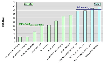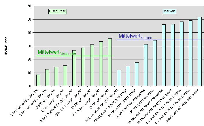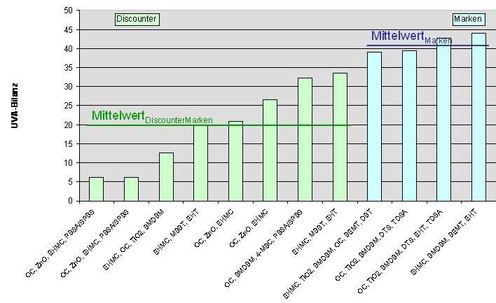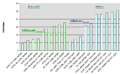 Abbildung 3: UVA-Bilanz der untersuchten Standardsonnenschutz-produkte untergliedert nach Marken- und Discounterprodukten sowie die für die jeweiligen Gruppen errechneten Mittelwerte.