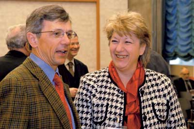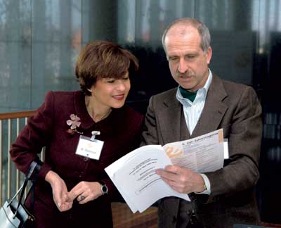 Dr. Christa Wirthumer-Hoche, hier im Gespräch mit dem wissenschaftlichen Tagungsleiter Professor Dr. Werner Aberer, überbrachte den Tagungsteilnehmern in Vertretung von Ministerin Maria Rauch-Kallat Grüße vom österreichischen Bundesministerium für Gesundheit und Frauen.