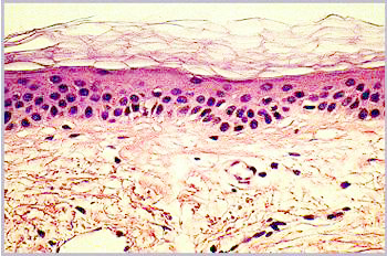 Die in-vitro-Hautmodelle eröffnen neue Wege, all dies Unzulänglichkeiten zu vermeiden. Durch sukzessives Züchten einer Dermis aus Fibroblasten und einer Epidermis mit Stratum Corneum aus Keratinocyten entsteht innerhalb von 5 Wochen ein Ganzhautmodell (Abbildung 4), das alle wesentlichen Schichten der Haut enthält (7) (Abbildung 5).