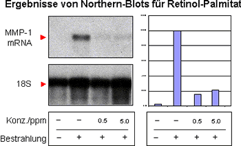 Die Bestrahlung von Fibroblasten mit simuliertem Sonnenlicht (UVA-Dosis von 10 J/cm2) führte erwartungsgemäß zu einer starken Induktion der MMP-1 mRNA-Synthese. Retinyl-Palmitat und Antioxidantien wie z.B. Propyl-Gallat reduzieren die sonnenlichtinduzierte Expression von MMP-1 sehr effektiv um rund 80 % bzw. 50 bis 75 % und wirken so der Lichtalterung der Haut entgegen.