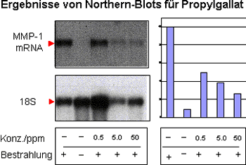 Fibroblasten-Kulturen eignen sich nicht nur zum Studium der Collagensynthese sondern auch zur Untersuchung bestimmter Photoalterungsprozesse. Seit längerem ist bekannt, dass vor allem exzessives Sonnenbaden die Haut altern lässt (5,6). UV-Licht, das auf einen Fibroblasten in der Haut trifft, veranlasst diesen, collagenabbauende Enzyme, sogenannte Collagenasen oder Metallomatrixproteasen (MMP's) zu produzieren. Diese schädlichen Enzyme zerschneiden das Collagen, den Hauptbestandteil des Hautbindegewebes, und führen damit zur frühzeitigen Entstehung von Falten (5,6). Die Reduktion der MMP-1-Synthese nach Sonnenexposition der Haut ist daher ein Hauptziel bei der Entwicklung von Anti-aging-Produkten. Ein idealer Anti-age-Wirkstoff inhibiert bereits in geringer Konzentration die Expression der Collagenase MMP-1. Die Produktion der mRNA ist im Verlauf der MMP-1-Synthese der erste und damit wichtigste Schritt. Wirkstoffe, die einen Effekt auf die mRNA-Produktion zeigen, haben somit automatisch auch einen Effekt auf die Proteinmenge und die Enzymaktivität von MMP-1. Die Quantifizierung der MMP-1 Synthese in Sonnenlicht-bestrahlten Hautfibroblasten erfolgte durch die Bestimmung der synthetisierten Menge der MMP-1-mRNA im Northern-Blot (5).