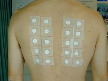 Der 24h Patch Test (Abbildung 1) ist eine international anerkannte Standardmethode nach COLIPA für den Vergleich verschiedener Produkte. Bei diesem Test werden die in Wasser gelösten Produkte unter kleinen Aluminiumkammern für 24 Stunden unter okklusiven Bedingungen auf den Rücken der Probanden aufgeklebt.